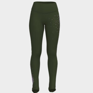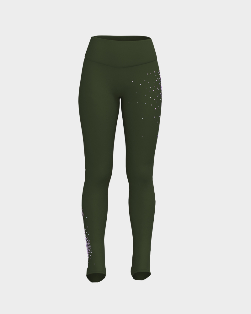 Leggings termici con copritacco e cintura alta fasciante in vita. Luminosi cristalli concentrati su un punto che sfumano sparsi sul fianco e fondo gamba